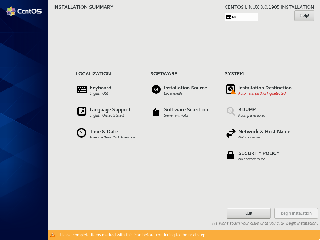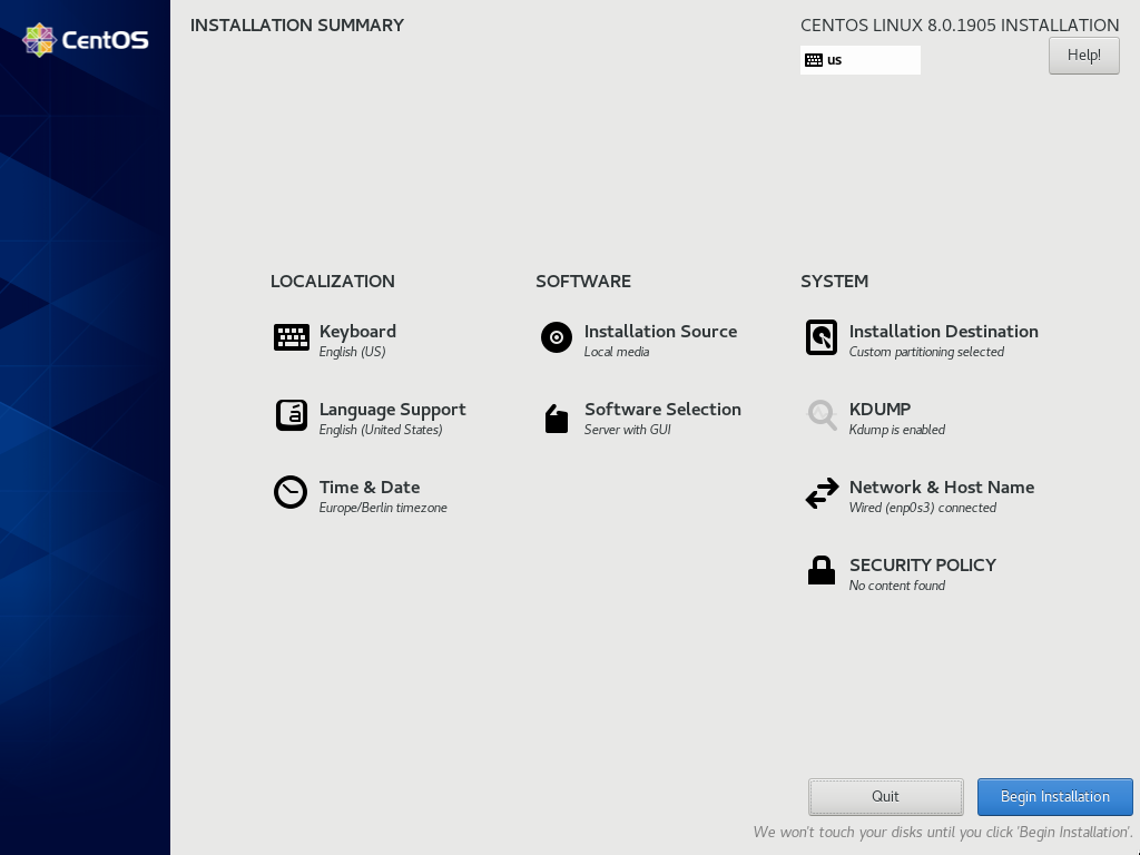 This is the hub of the installation that will guide you through the basic configuration. Also, until you click “Begin Installation” there won’t be changes happening on your computer. So be relaxed and don’t panic. I will review each step of the hub excluding “keyboard” which should have been set on the second step.