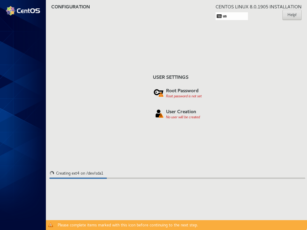 As you can see the installation process has started, now don’t go away to take your coffee yet: you still have to configure your user and root user. One of them has to be filled and you have three choices: