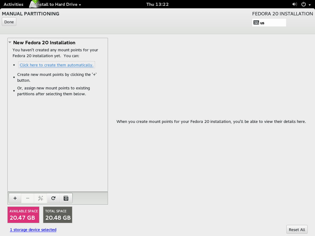 This is the easiest case; just select “Click here to create them automatically” and then click “Done”. This outcome is the same as selecting “Automatically configure Fedora Installation…” in step 5.3.
