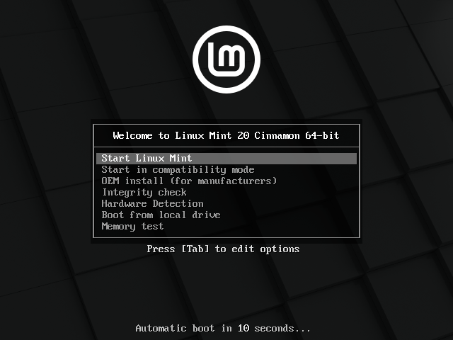 The first thing you need to do is to get the image from the Linux Mint official website. Once you have downloaded the image you prefer (either Cinnamon or MATE) it's time to burn it on a media support. Once done, boot from the USB or CD/DVD and you will be facing this screen. Wait 10 seconds or select the first option.