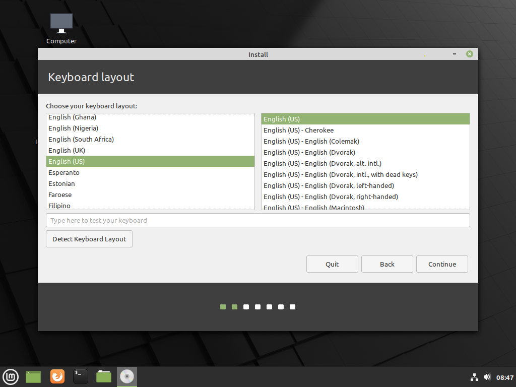 Here you can select the keyboard layout according to the keyboard you own. You can select it manually or press Detect Keyboard Layout and follow the instructions to identify the layout.