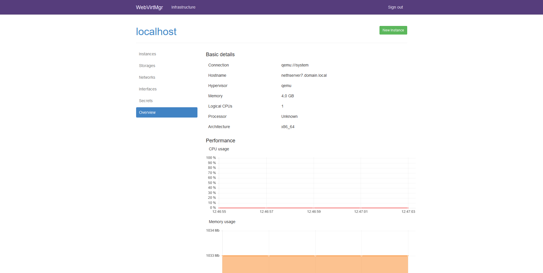 The interface is powered by the WebVirtManager project. Thanks to this, the administrator is able to manage virtual machines, virtual networks and storage pools even on multiple hypervisors.